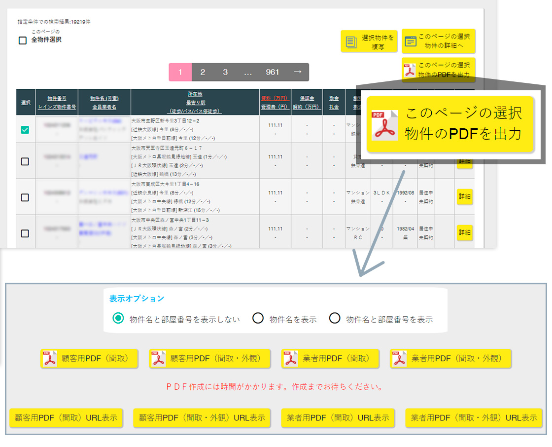 物件入力画面からボタンひとつで出力ができ、接客時に印刷でお見せすることや、業者に情報を送るときに便利に使えます。また、URLも発行できるため、メールに張り付けることができます。