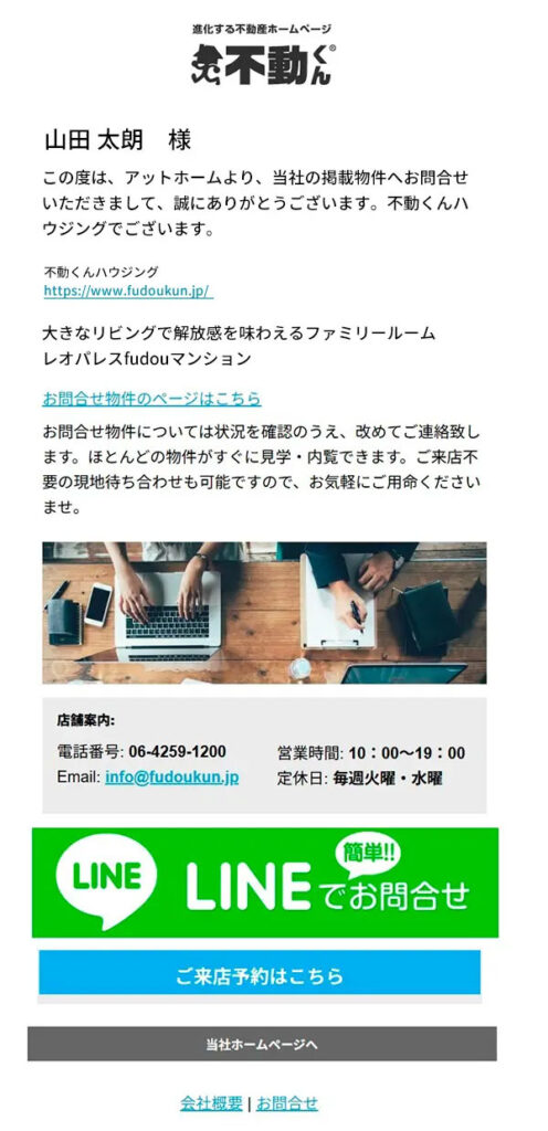 お客様からのお問合せには、区分(売却・賃貸・購入など)ごとに設定できるオリジナル自動返信メールを即時送信。「すぐに連絡が来た」という安心感が得られ、次のアクションにつなげることができます。