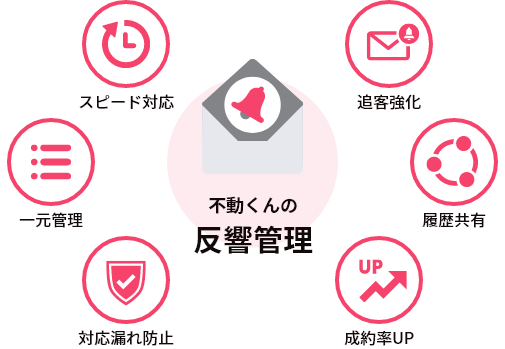 自社ホームページや大手ポータルサイトからの反響をひとつの画面に集約。反響元や対応状況が一覧でわかるため、対応漏れや二重対応を防ぎます。